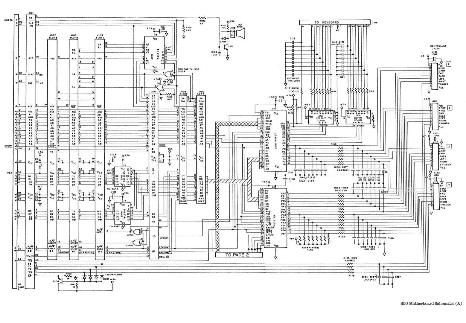 - Motherboard Console, es la placa principal, y en ella se encuentran los chips POKEY, PIA (Peripherical Interface Adaptor), el conector de cartuchos, los cuatro puertos de joystick, la ROM, los circuitos integrados auxiliares y cuatro conectores para conectar el resto de placas y el teclado.