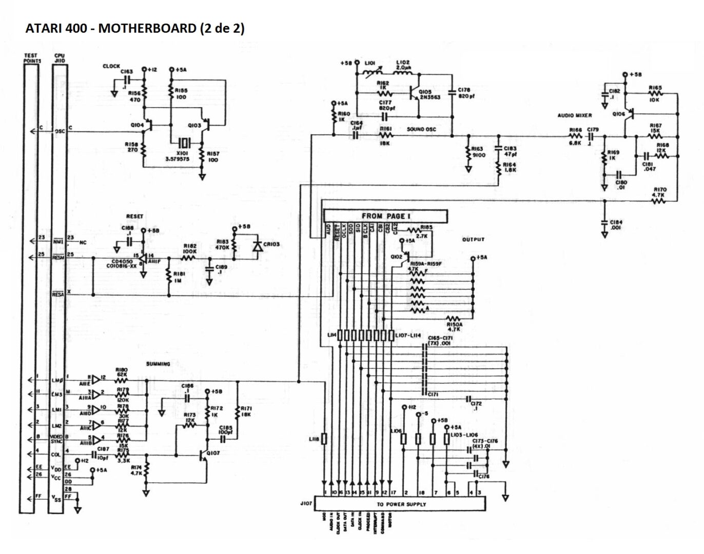 He desarmado el Atari 400, y extraído la placa de alimentación (PWR). Compruebo los condensadores, y todos están bien, salvo dos ( -> 22μF/16V y -> 10μF/16V), que tienen el ESR un poco alto, pero dentro de lo normal para esas capacidades. Los sustituyo. Compruebo los diodos del puente rectificador y tres están mal. Estos son 1N5391 y están marcados como CR206, CR207, CR208 y CR209. Como ya no se encuentran salvo en Aliexpress, he buscado los posibles equivalentes que tenía por aquí y los he sustituido por 1N5404.