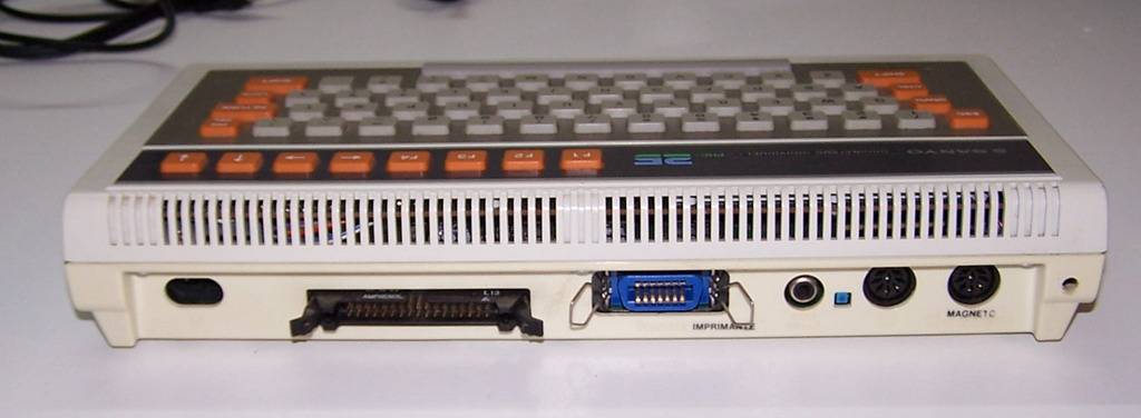 Puertos de E/S | Conector de cassette: DIN-8 Puerto de impresora RS-232C Salida RGB Peritel DIN-8 ![]() Salida de video compuesto Puerto de ampliación | ||