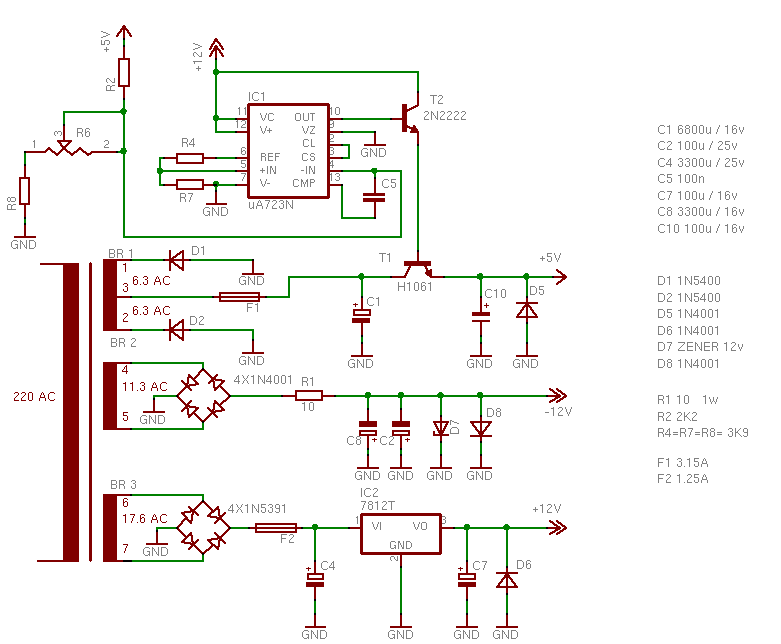 Siguiendo el esquema de la de +3, he comprobado el puente de diodos, los condensadores, el diodo y finalmente el zener de 12V, etiquetado como D7, que falla. Además la resistencia R1, de 10Ω y 1W, se ve quemada. Así que tras pedir el zener, un 1N4742 y la resistencia, y sustituirlos, la fuente funciona perfectamente.