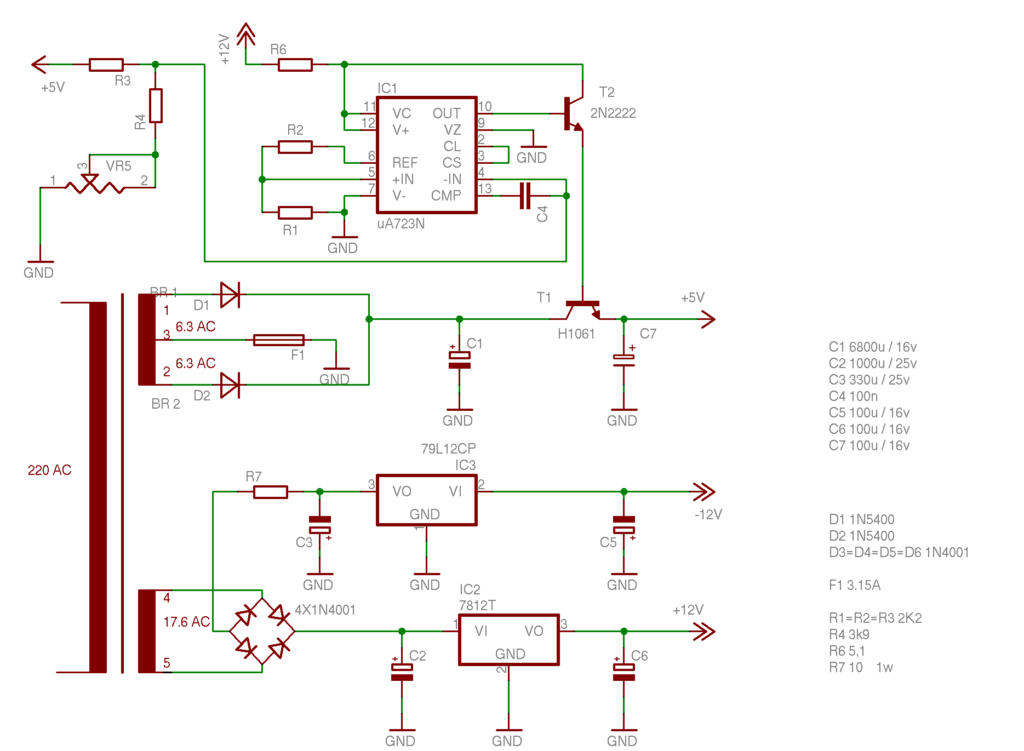 Siguiendo el esquema de la de +2A compruebo el fusible y los 6 diodos, que están bien. Al fijarme veo que un transistor, un 79L12CP según el esquema, está como si lo hubieran cortado por la mitad, ya que le falta todo el frontal donde va el código. Como suele ser habitual, no tengo ninguno para sustituirlo a mano. Cuando me ha llegado, lo he sustituido y la fuente funciona perfectamente.